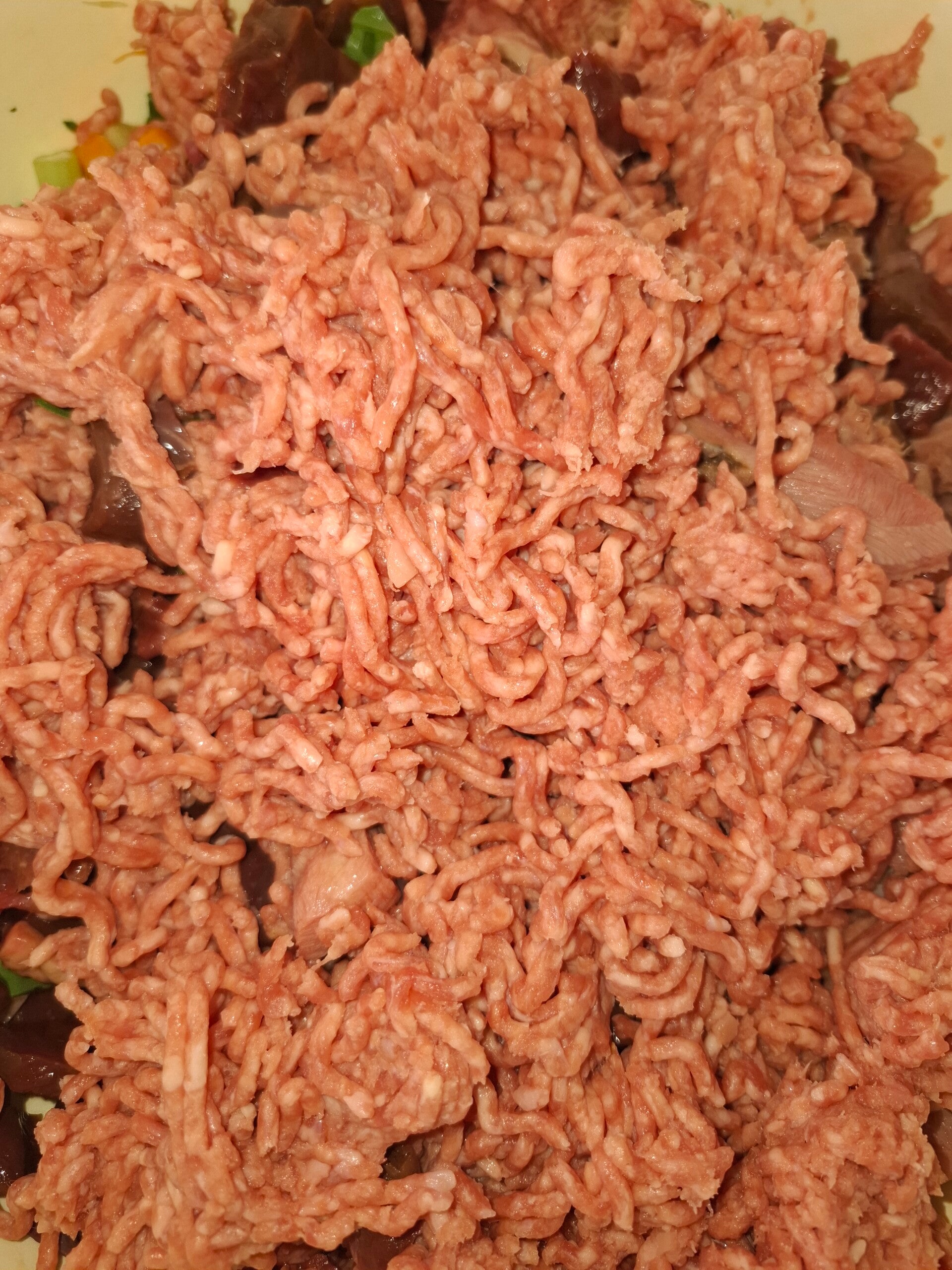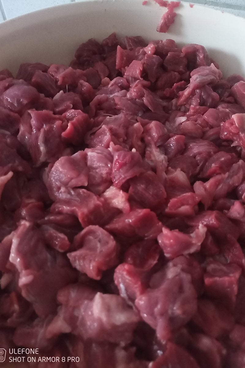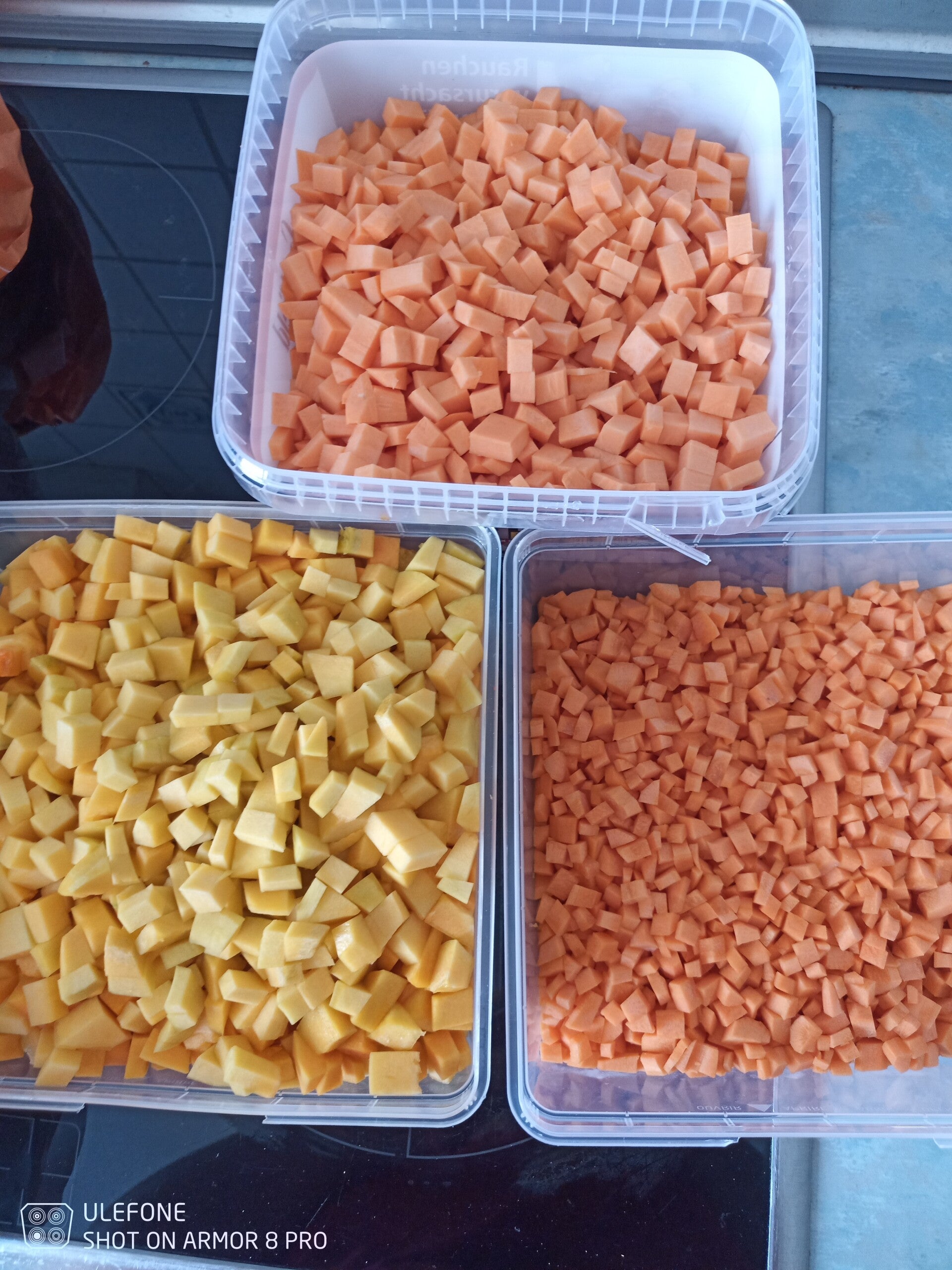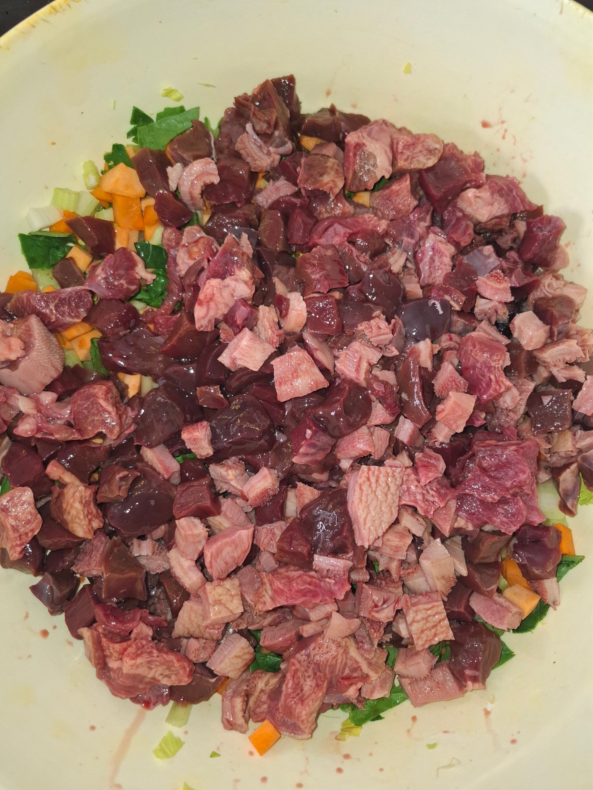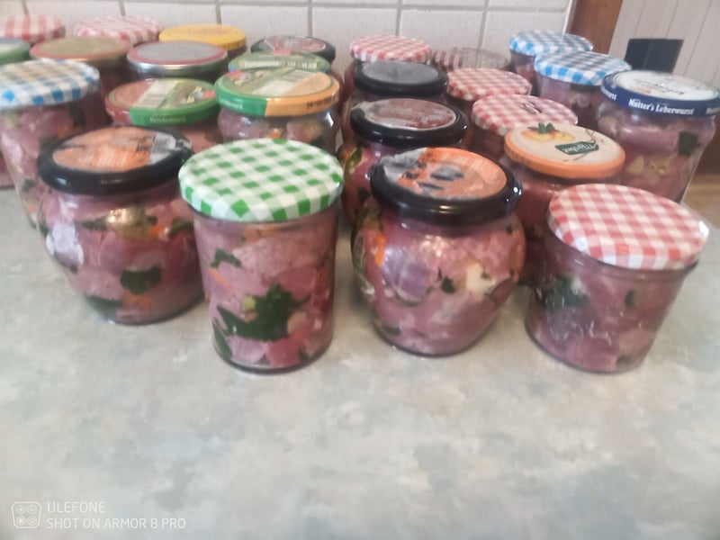 ⅓ Fleisch wird zu Hackfleisch gemahlen und ⅔ schneide ich in kleine Würfel. Auch die Gemüse,- und Obstsorten, so wie die Inneren, werden gewürfelt. Alles mischen und in Twist-Off Gläser füllen. Anschließend werden die verschlossenen Gläser für mindestens 2 Stunden eingekocht. Über Nacht auskühlen lassen.