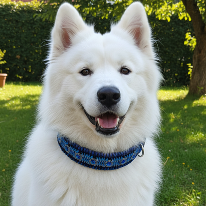 Trotz seiner Breite ist das Halsband durch die spezielle Flechttechnik extrem beweglich und schmiegt sich weich an den Hundehals an.