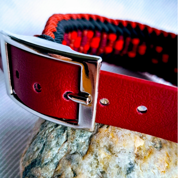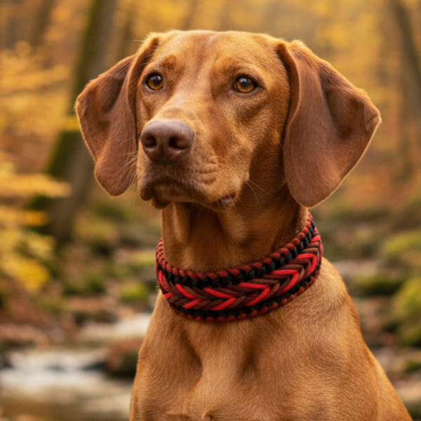 Dieses handgefertigte Unikat "Glut & Erde" ist eine Hommage an die satten Farben des Herbstwaldes und die Wärme eines knisternden Feuers. Die intensiven Rot- und Braunschattierungen vereinen sich zu einem kraftvollen und zugleich eleganten Begleiter, der die Vitalität und die tiefe Verbundenheit Ihres Hundes zur Natur unterstreicht. Perfekt für Hunde, die Wert auf einen charakterstarken Auftritt und höchste Qualität legen.