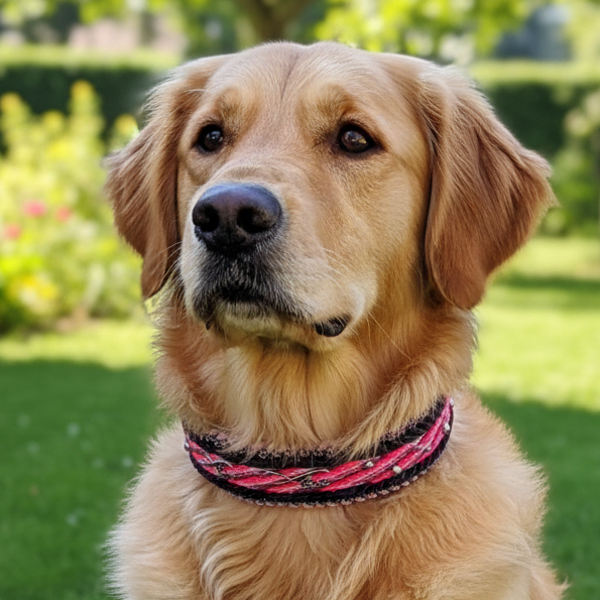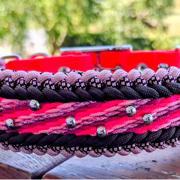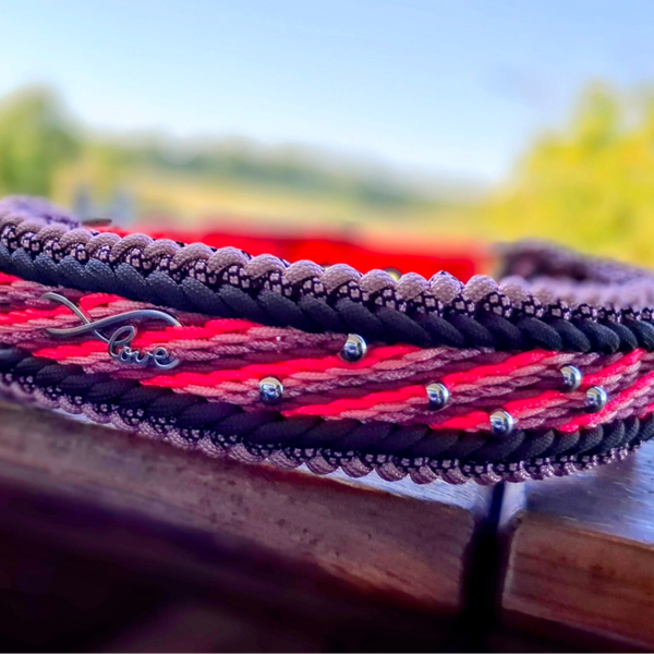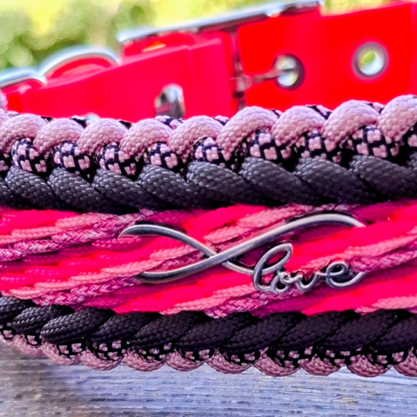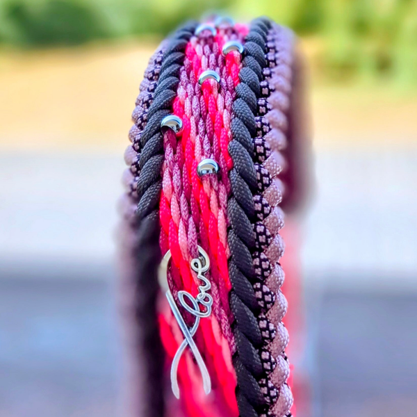 Die Flechtung kombiniert ausdrucksstarke Pink- und Lilatöne mit tiefem Schwarz. Der silberne "Love"-Anhänger setzt ein liebevolles Statement. Mit 5 cm Breite bietet es bei starkem Zug eine optimale Druckverteilung und höchsten Komfort – ein wunderschönes, aber robustes Unikat für große Hunde.