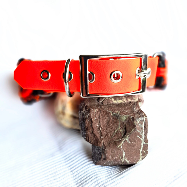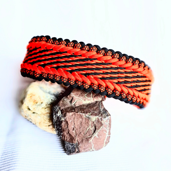 Das beeindruckende, extrabreite Flechtmuster in kräftigem Orange und Schwarz ist ein echter Blickfang und erhöht die Sichtbarkeit deines Hundes. Mit 5 cm Breite sorgt dieses Halsband für optimalen Tragekomfort und eine hervorragende Druckverteilung – die perfekte Ausrüstung für alle, die ihren Hund bei jedem Wetter sicher und stilvoll führen wollen.