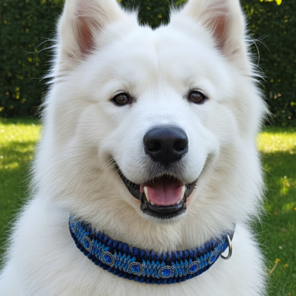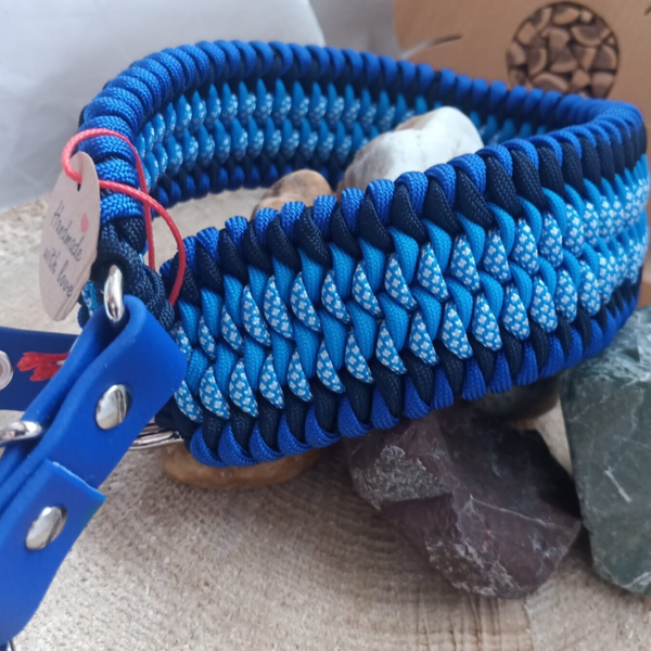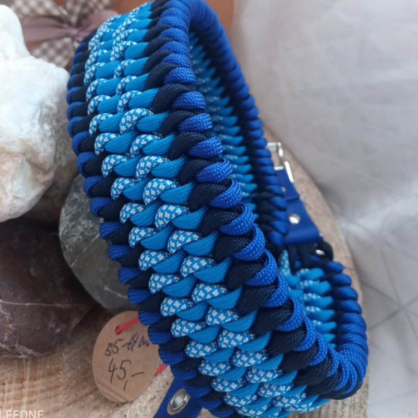 Das Flechtmuster vereint tiefes Marineblau mit lebhaftem Hellblau, was an die Weite des Ozeans erinnert. Durch die Breite von 5 cm ist dieses Halsband ideal für große Hunde, die einen Halsumfang bis 62 cm haben. Es garantiert hervorragende Druckverteilung und ist dein verlässlicher Begleiter bei jedem Abenteuer.