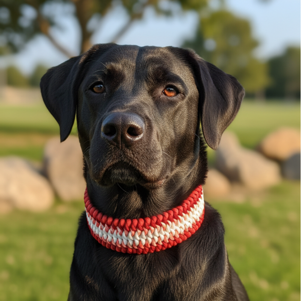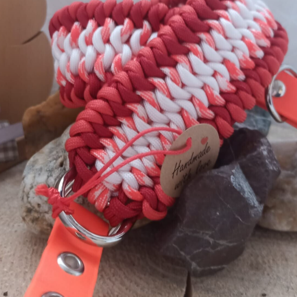 Dieses Halsband strahlt pure Lebensfreude aus! Das Unikat "Lebensfreude" kombiniert die Power von Rot und Orange mit klarem Weiss zu einem dynamischen Flechtmuster, das alle Blicke auf sich zieht.