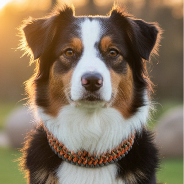 Ein Unikat, das die Farben des späten Sommers und Herbstes einfängt! Das Halsband "Herbstlicht" besticht durch ein lebendiges und gleichzeitig naturnahes Flechtmuster aus frischem Grün, leuchtendem Orange und Weiss/Naturton.