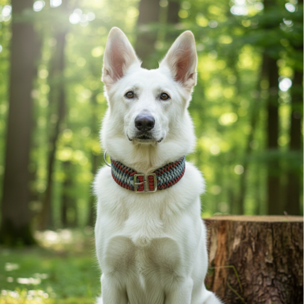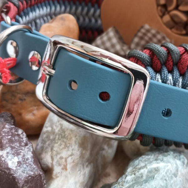 Dieses Unikat ist ein Zeichen von Stolz und Stärke! Das Halsband "Wappenstolz" besticht durch eine kraftvolle Flechtung, die tiefes Rot, kühles Blau und neutrales Grau/Weiss kombiniert.