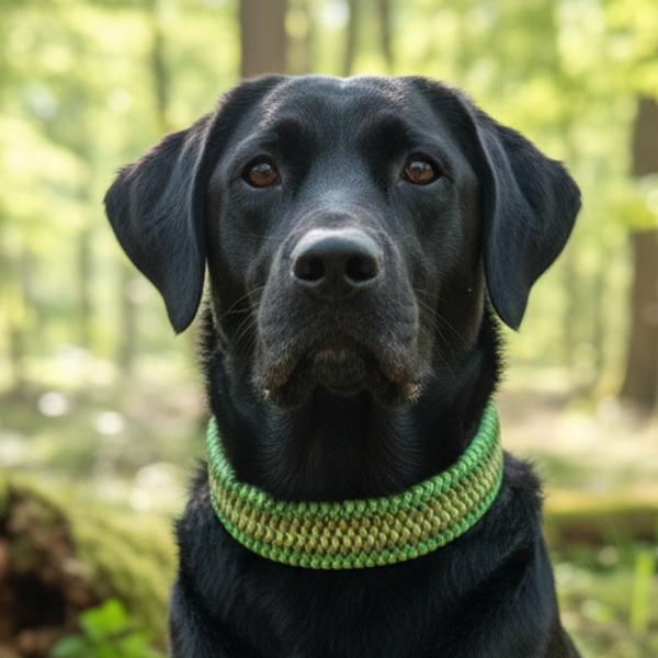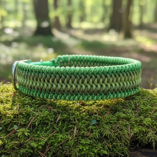 Rhönblick besticht durch eine kraftvolle Flechtung, die verschiedene Nuancen von Grün ineinander vereint: von leuchtendem Hellgrün über frisches Olivgrün bis hin zu marmorierten Grüntönen. Durch seine massive Breite von 5,5 cm und den großen Umfang ist dieses Halsband ideal für sehr starke, imposante Rassen (HU bis 72 cm). Es garantiert höchsten Tragekomfort durch optimale Druckverteilung und bietet einen zeitlosen, farbintensiven Look, der die Stärke Deines Hundes unterstreicht.