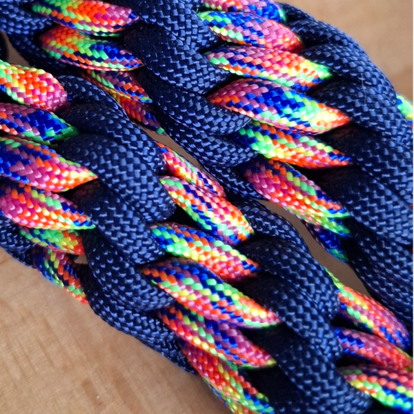 Dieses 0,90 m kurze Unikat ist Dein professioneller Kurzführer! Geflochten in der robusten 6-Strang-Technik (Variante des Guckaisee-Musters), bietet es unschlagbare Stabilität. Die Kombination aus klassischem Dunkelblau und leuchtendem Neon-Multicolor sorgt für Sicherheit und einen sportlichen Akzent.