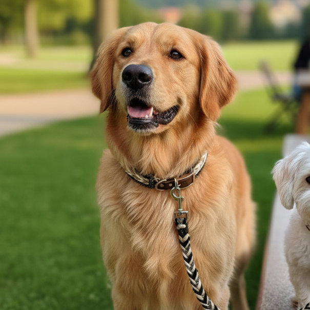 🧶 Die 6-Strang-Flechtung im Halsband und das Chevron-Muster der Leine bieten maximale Stabilität, eine dichte Haptik und einen edlen Look.