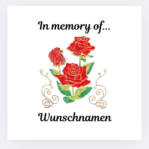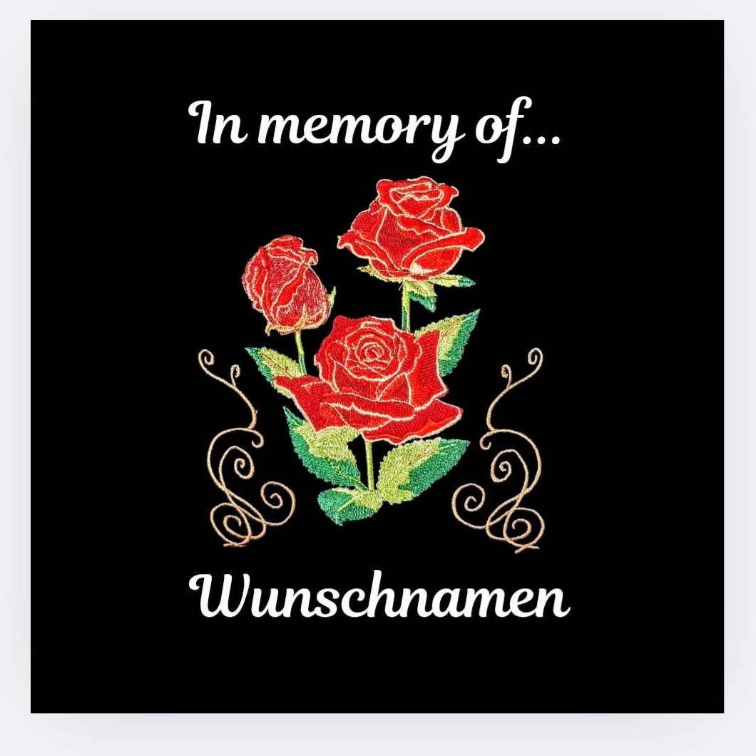 „Ein würdiges Andenken an deinen Seelenhund. Drei wunderschöne rote Rosen und der Schriftzug ‚In memory of...‘ machen dieses Kissen zu einem Ort der liebevollen Erinnerung.“