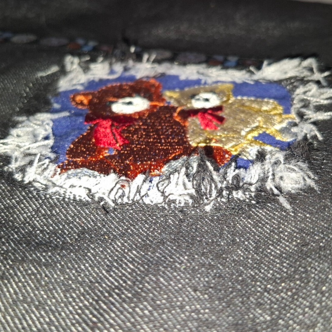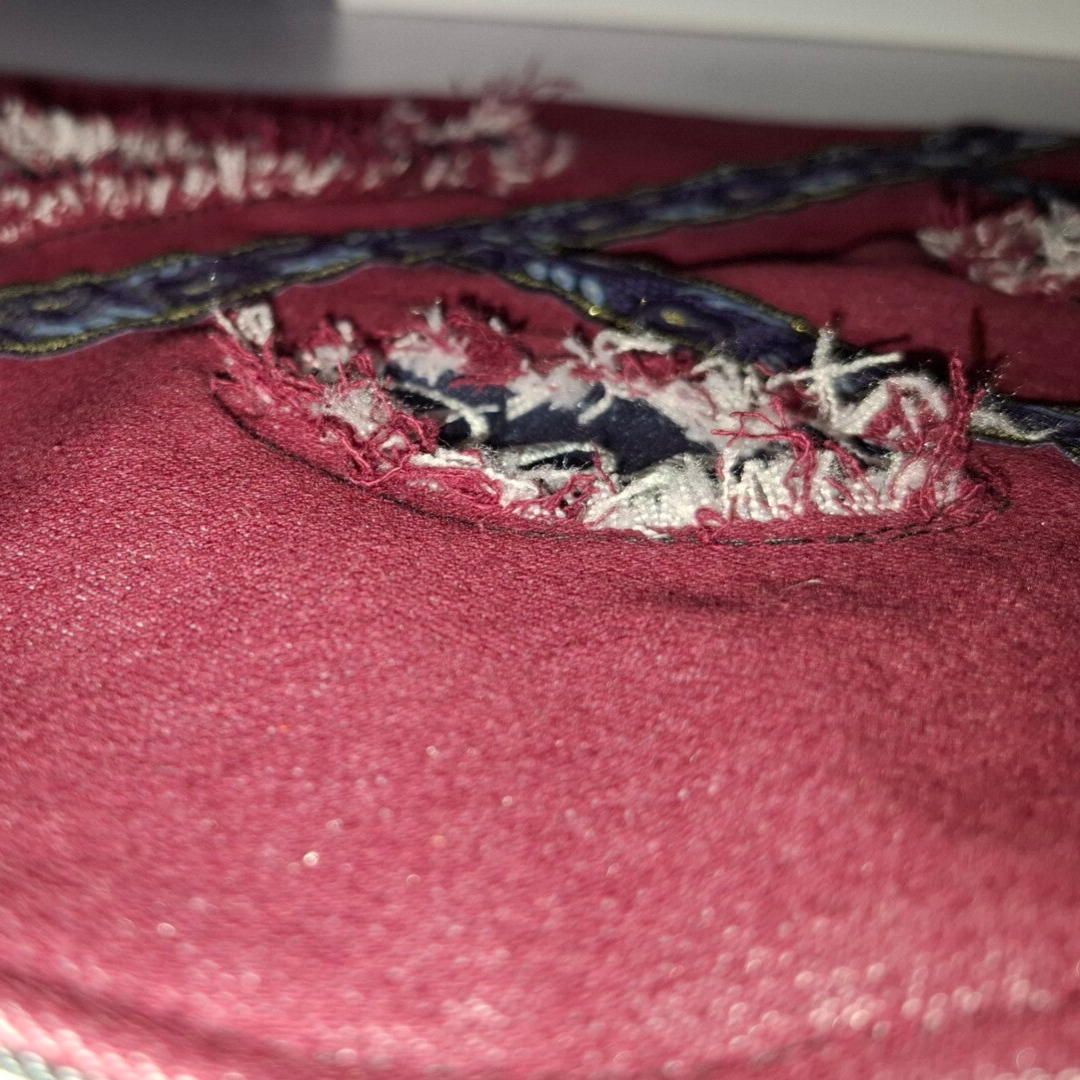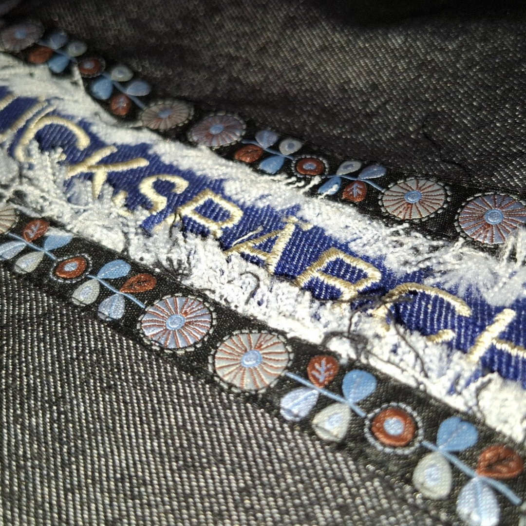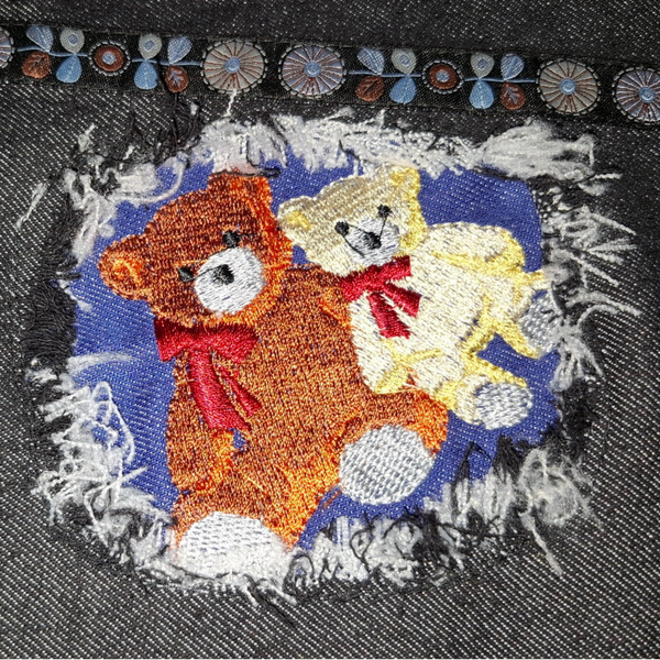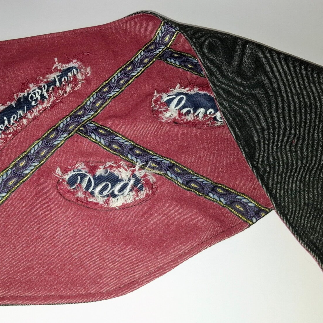 Denim-Art Design: Hochwertiger Jeans-Stoff im modernen „Used-Look“ mit handgezupften Fransen, kombiniert mit edlen Borten.