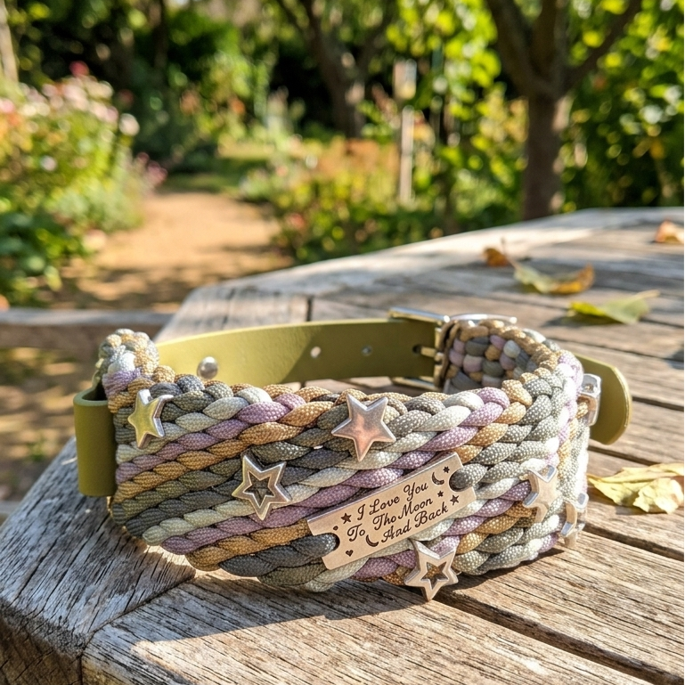 Dieses Halsband ist mehr als nur Zubehör – es ist ein Liebesbeweis. Das eingearbeitete Schild „I love you to the moon and back“, umrahmt von acht funkelnden Sternen, macht es zum emotionalen Highlight am Hundehals. Die kühlen Grautöne wirken zeitlos elegant, während der grüne Adapter für einen modernen Akzent sorgt. Durch die Verwendung von massivem Edelstahl ist dieses Unikat extrem wertbeständig und bereit für jedes Abenteuer.