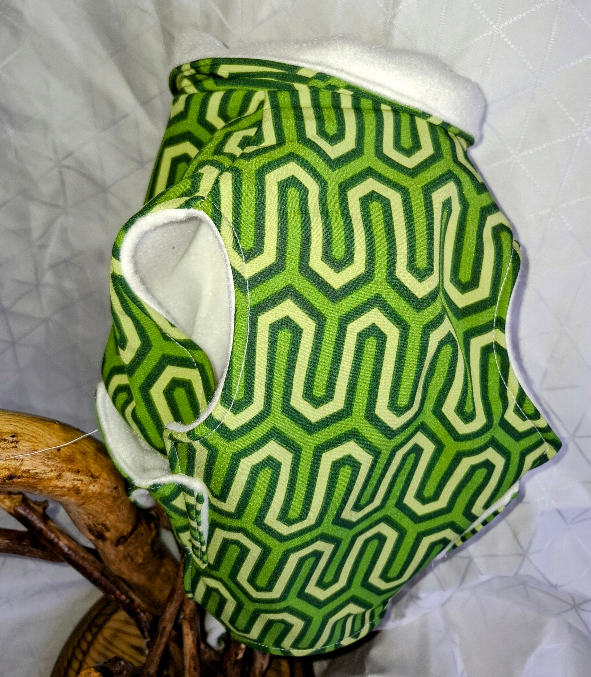Dieses Rhön-Mäntelchen ist ein exklusives Einzelstück aus unserer Design-Entwicklung. Das moderne geometrische Muster in verschiedenen Grüntönen macht deinen kleinen Schatz zum echten Hingucker auf jeder Gassi-Runde. Da es sich um eines unserer begehrten Musterstücke handelt, bieten wir es dir als absoluten „Glücksgriff“ zum Aktionspreis an!