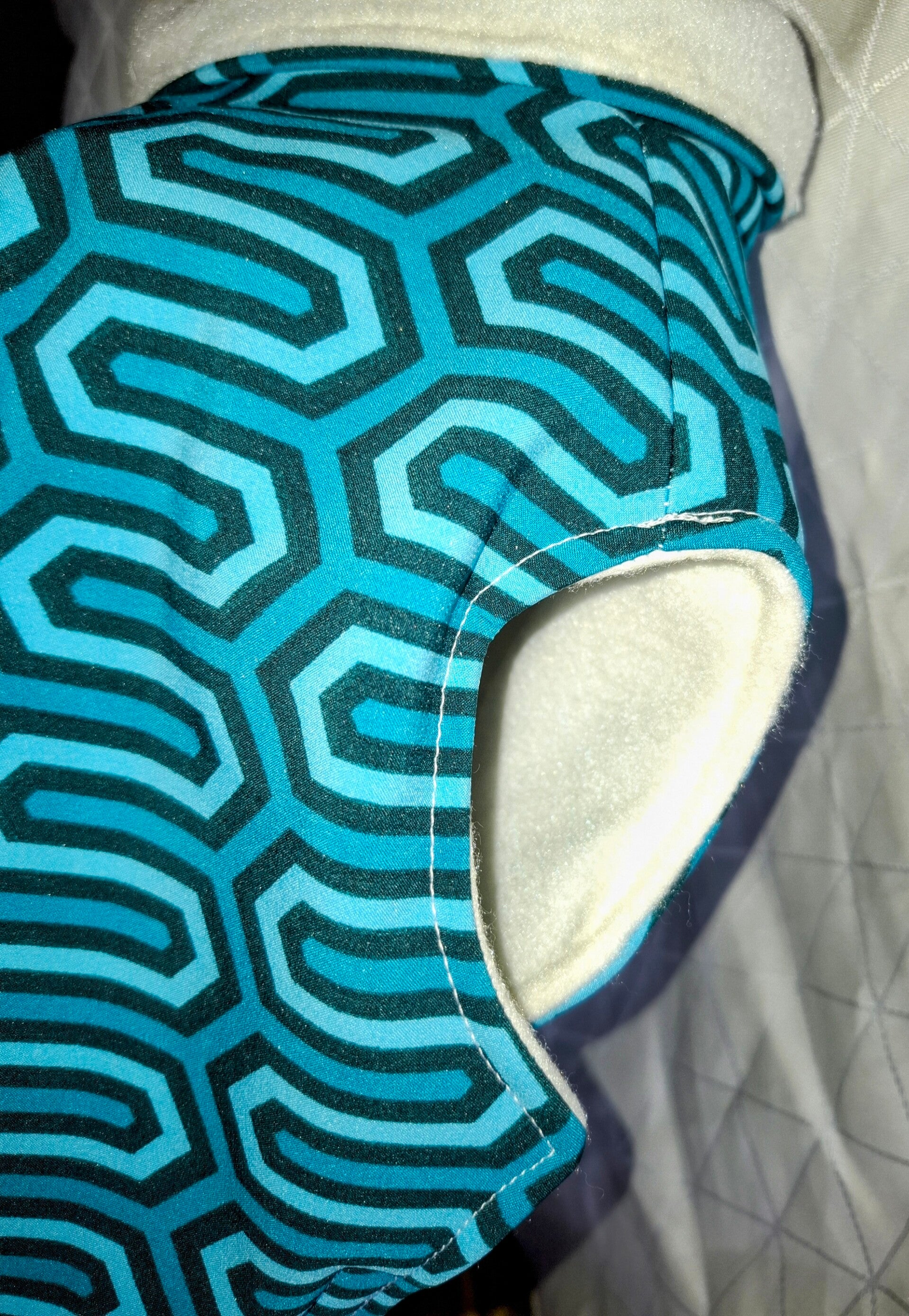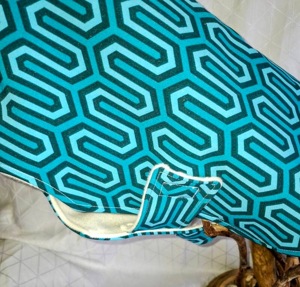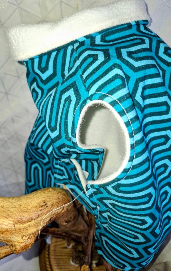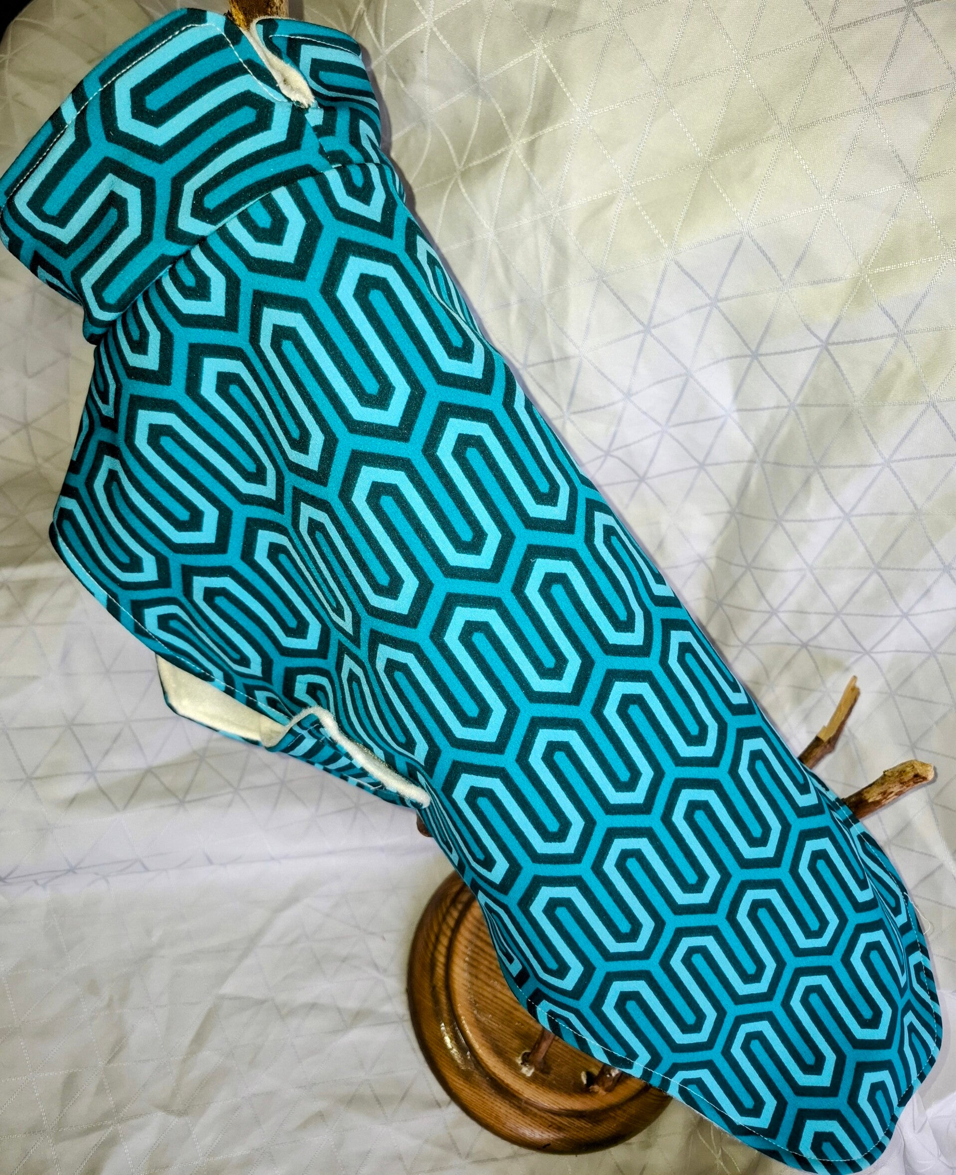Dieses Rhön-Mäntelchen besticht durch sein modernes geometrisches Muster in leuchtendem Türkis und kühlen Blautönen. Ein echter Blickfang für jede Gassi-Runde! Da es sich um ein exklusives Musterstück aus unserer Design-Entwicklung handelt, bieten wir dieses Unikat zum einmaligen Glücksgriff-Preis an!