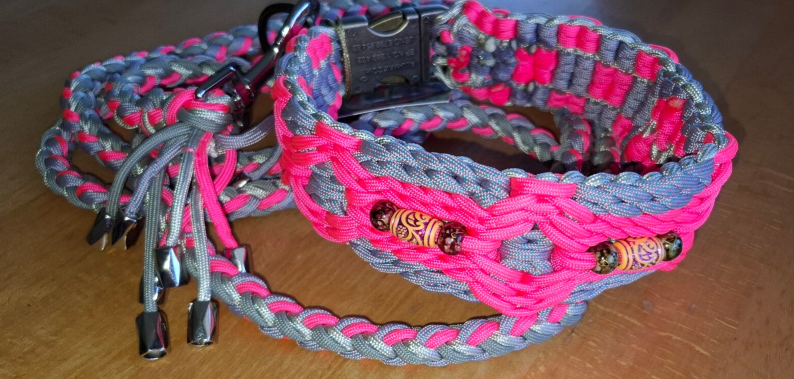 Dieses handgefertigte Set in leuchtendem Pink und edlem Silber ist für alle Hunde gemacht, die gerne im Mittelpunkt stehen. Das Besondere: Es wurde im kreativen „Freestyle“-Muster geflochten, bei dem hochwertige Perlen direkt in das Halsband eingearbeitet wurden. Ein echtes Einzelstück vom „gold’nen Tisch“!